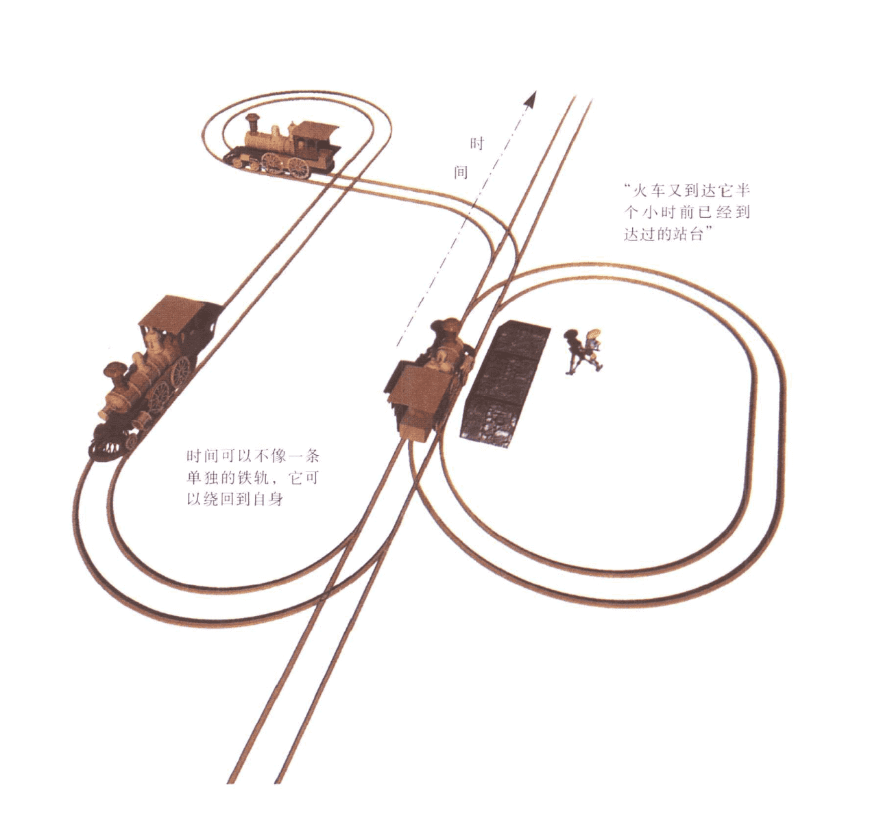 大家看看这个火车轨道,想象一下你沿着这个闭环行走,这意味着在某个时刻,你将重新开始经历原本已经结束了的时间。有点类似于“既视感”(deja vu)这种现象,即你现在正在某地做某件事,但却仿佛曾在以前某个时刻 经历过一样的场景,有一种似曾相识的感觉。在物理学的理论研究中,这种结构通常被称为“封闭类时曲线”(closed time-like curves, CTC),也就是我们俗称的“时光机”。