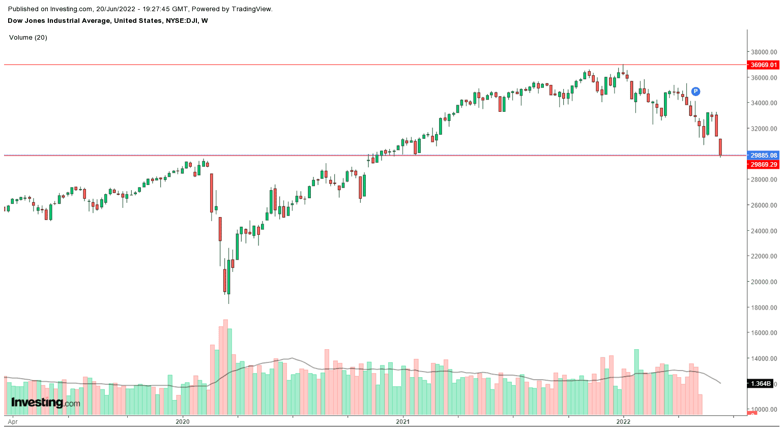 上周美股大盘以两年来最大单周百分比跌幅收盘。从周线看,道琼斯下跌-4.79%,S&P500指数下跌-5.79%,纳斯达克100指数下跌-4.79%。从市场因素来看,尽管失业率还在下降,但是交易者仍然对经济可能进入衰退极度恐慌,主要由于美联储调控通胀水平的力度加大,在周三宣布基准利率上涨0.75个百分点,这也是自1994年以来最大上升幅度;并且,美联储声称,在7月可能还会升息。