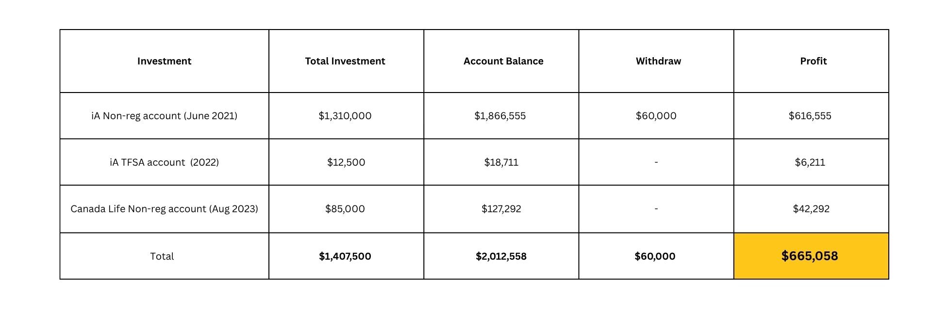 在 AiF 的协助与建议下,LILY将自有资金 65 万元投入至非注册账户(Non-Registered Account)的保本基金。随着投资组合逐步展现成效,她对策略的信心不断增强,随后 6 次追加投资共计 66 万元,期间仅灵活取出 6 万元。这份坚定的执行,源自她对 AiF 专业判断的高度认可。