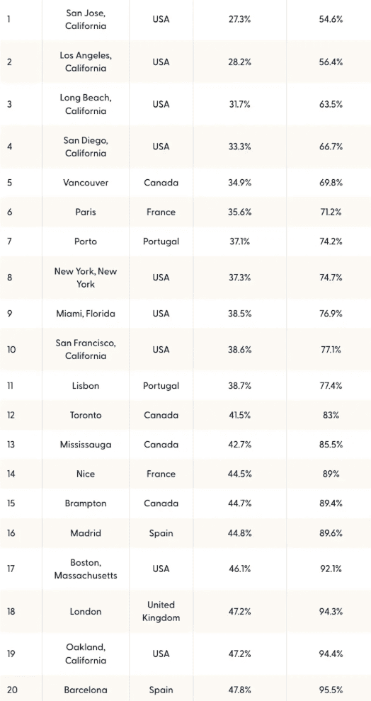 在全球范围内,加州圣何塞(San Jose)被评为购房最难的城市。当地单身人士仅能负担房价的 27%,即便是双薪家庭也只能覆盖约一半(54.6%)的开支。