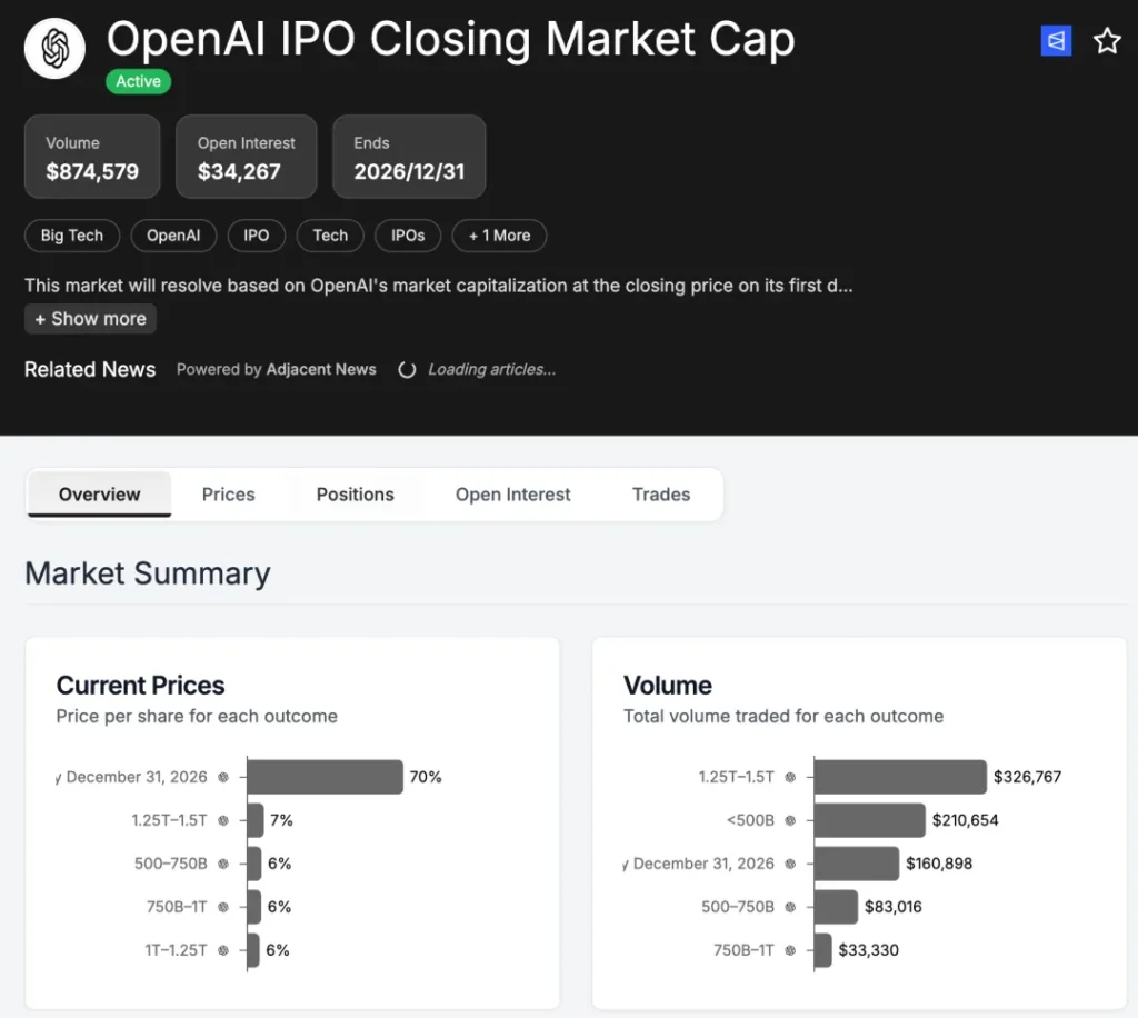 在预测市场 Polymarket 上,与 OpenAI 相关的押注热度显著上升,且呈现出高度分化的结构: