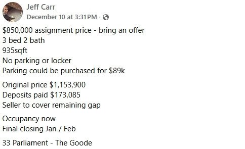 在 Facebook 各类房产交易群中,一套位于多伦多市中心的三居室公寓近期挂牌转让,标价比原始购买价低了 30 多万加元,并明确写着“欢迎出价(bring an offer)”。