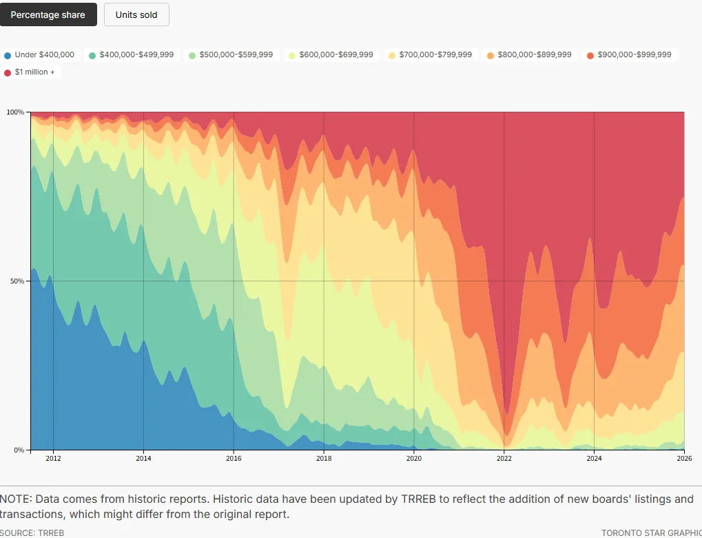 TRREB 的数据精准刻画了市场的剧变:在疫情高峰期,售价在 40 万至 50 万加元区间的公寓占比仅为 2.5%;而今年 1 月,这一数字已大幅飙升至 26.9% 以上。