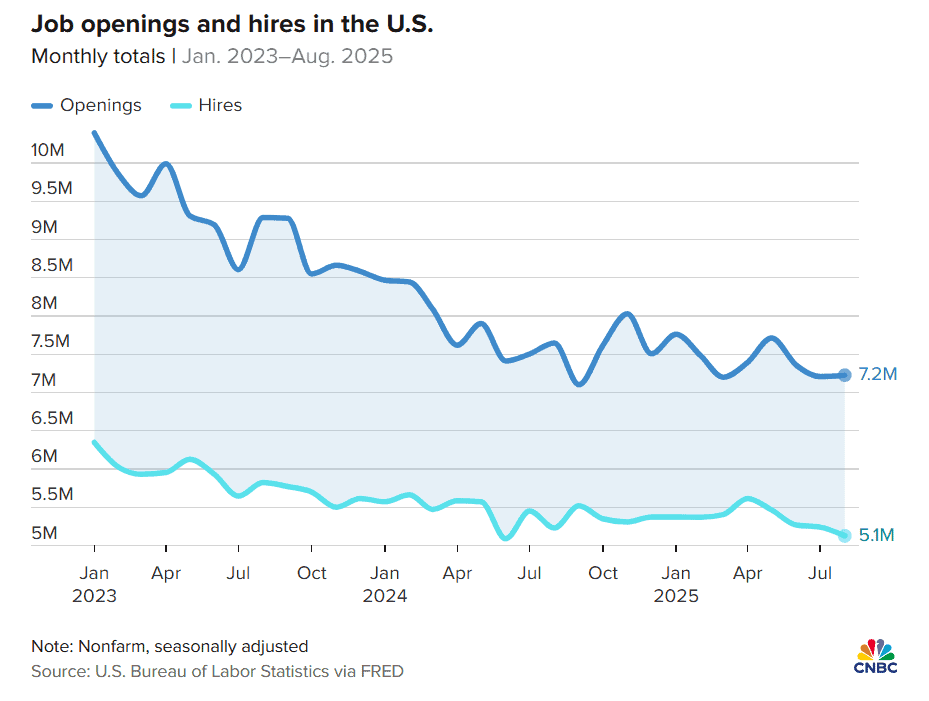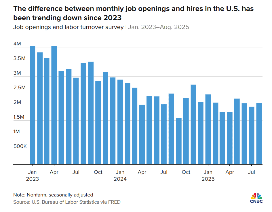 自2022年3月职位空缺峰值超1200万以来,美国就业机会总体呈下降趋势。当时职位数几乎是可用劳动力的两倍。而截至8月(由于政府关门,最新数据止于此),职位空缺为720万,而招聘仅为510万,供需比例基本持平。