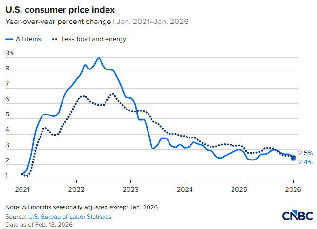 美国劳工统计局周二表示,衡量通胀的重要指标——消费者价格指数(CPI)——1月份同比上涨2.4%。这一数字低于12月份的2.7%,也低于市场预期。