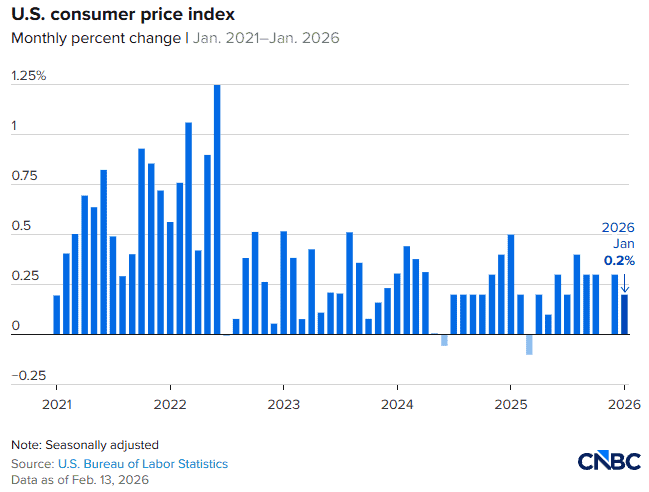 牛津经济研究院首席经济学家伯纳德·亚罗斯在周五的一份报告中写道:“1月份CPI的下行意外对美联储来说是一个好消息,但我们不会基于一次通胀数据就改变货币政策的基准预测。”他还表示:“停摆对价格数据造成的持续扭曲、今年稳健增长的前景以及逐渐稳定的就业市场,将使央行维持观望立场直至6月。”