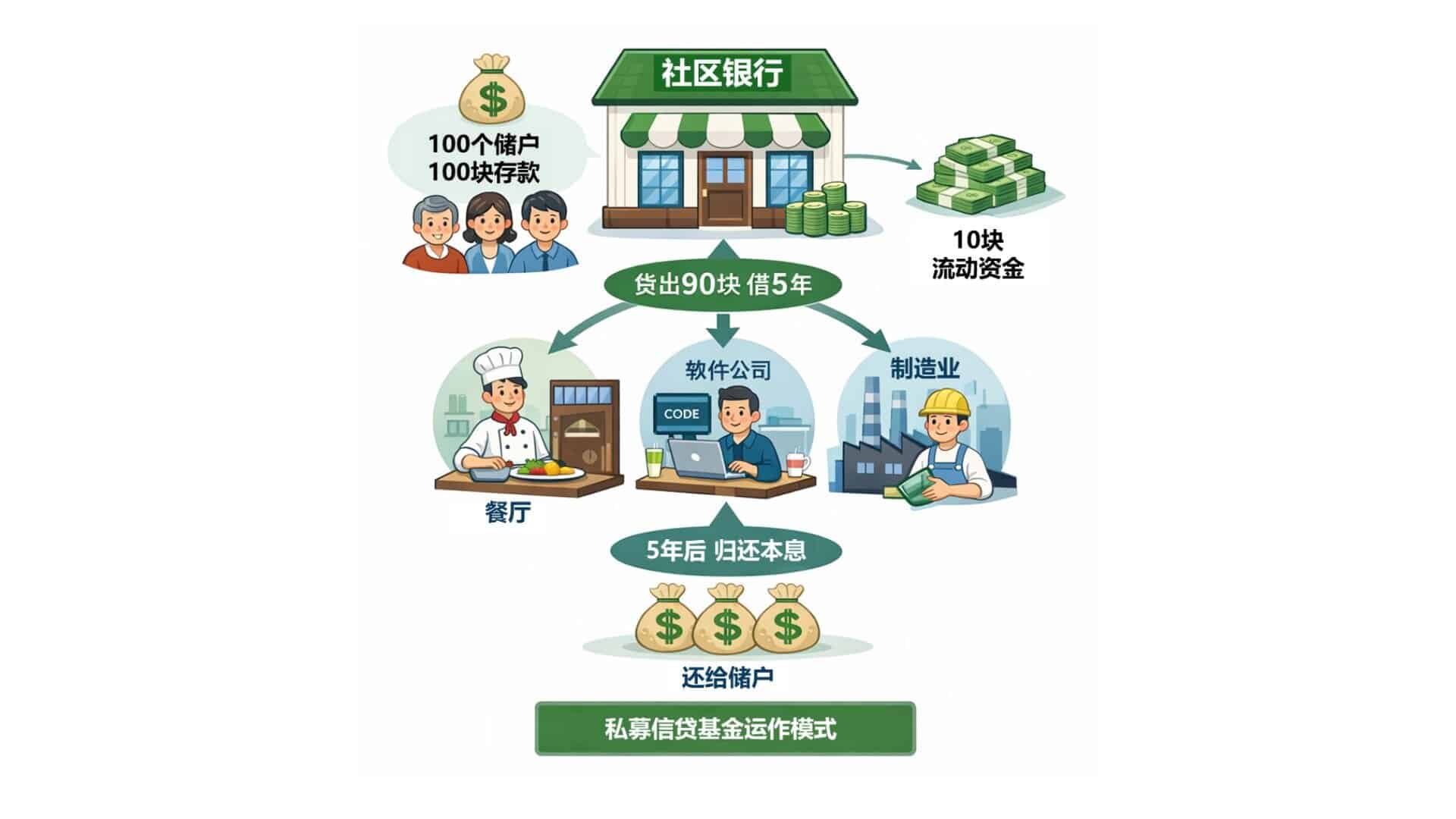 想象你开了一家社区银行,有 100 个储户,每个人拿 1 块钱出来,一共就是 100 块。你留出其中 10 块做流动资金,另外 90 块借给外面的企业。可能借给开餐厅的老板,可能借给做软件的公司,也可能借给制造业的工厂。这样你就可以靠利息赚钱。