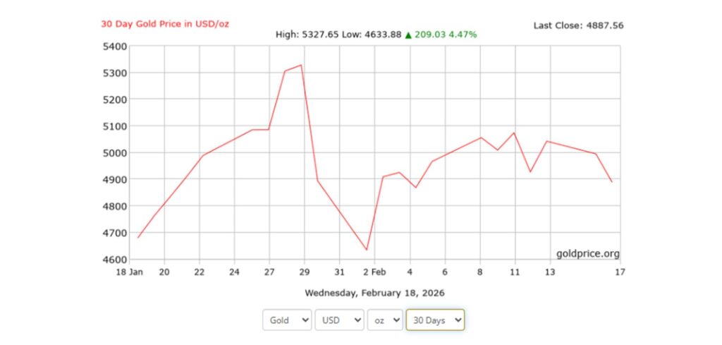 1 月 29 日前后,黄金市场突然出现剧烈震荡。短短三天时间,金价从 5600 美元的高位快速回落至 4400 点附近,跌幅高达 21%。市场情绪在极短时间内由乐观转为恐慌,投资者纷纷抛售离场,场面可以说相当混乱。