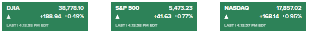 - 标普 500 指数上涨 0.77%,收于 5,473.23 点;纳斯达克综合指数上涨 0.95%,收于 17857.02 点。道琼斯工业平均指数 指数上涨 188.94 点,涨幅 0.49%,收于 38,778.10 点,结束了四日连跌。