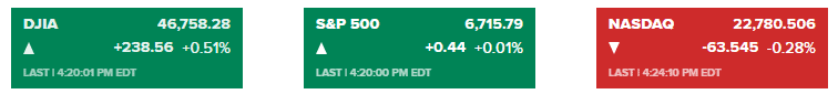 标普500指数几乎收平,上涨0.01%,收于6,715.79点;纳斯达克综合指数下跌0.28%,收于22,780.51点。道琼斯工业平均指数表现最佳,上涨238.56点,涨幅0.51%,收于46,758.28点。罗素2000指数同样上涨0.72%,收于2,476.18点。四大指数在盘中均创下历史新高。