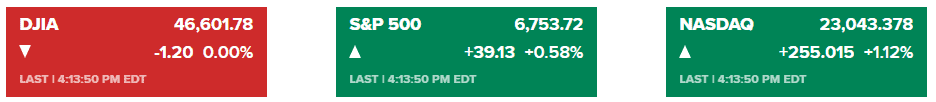 标普500指数上涨0.58%,收于6,753.72点,受科技、公用事业及工业板块推动,这三个板块也分别创下收盘新高。纳斯达克综合指数上涨1.12%,收于23,043.38点。道琼斯工业平均指数微跌1.20点,收于46,601.78点。