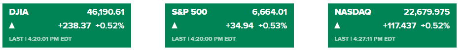 道琼斯工业平均指数上涨238.37点,涨幅0.52%,收于46,190.61点;标普500指数上涨0.53%,收于6,664.01点;纳斯达克综合指数上涨0.52%,收于22,679.98点。