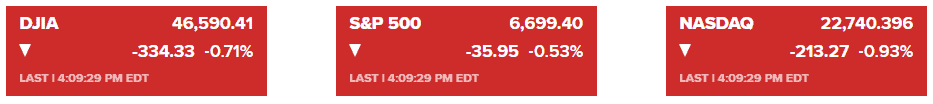 道琼斯工业平均指数下跌334.33点,跌幅0.71%,收于46,590.41点。标普500指数下跌0.53%,收于6,699.40点;纳斯达克综合指数下跌0.93%,收于22,740.40点。盘中,道指一度下跌超400点(约1%),标普500和纳指盘中跌幅则分别扩大至1.2%和1.9%。