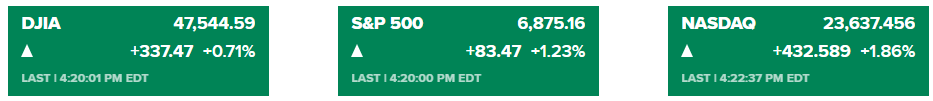 标普500指数上涨1.23%,收于6,875.16点,首次收盘突破6800点大关;纳斯达克综合指数大涨1.86%,收于23,637.46点,受英伟达(Nvidia)等芯片股推动;道琼斯工业平均指数上涨337.47点,涨幅0.71%,收于47,544.59点。三大指数以及小盘股指标罗素2000均创下历史新高。