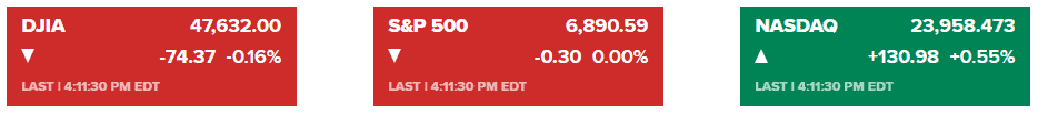 道指最终下跌74.37点,跌幅0.2%,收于47,632.00点;标普500指数微跌至6,890.59点;纳斯达克综合指数表现相对坚挺,上涨0.55%,收于23,958.47点,创下历史新高,得益于英伟达(Nvidia)的强劲表现。道指盘中一度上涨多达334点,触及历史新高后转跌。