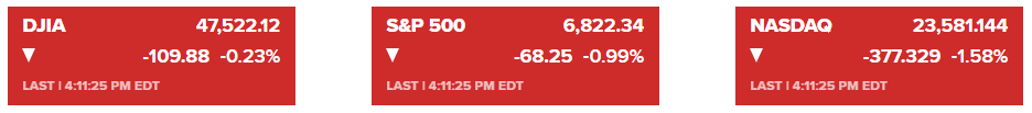 标普500指数下跌0.99%,收于6,822.34点;纳斯达克综合指数下跌1.57%,收于23,581.14点;道琼斯工业平均指数下跌109.88点,跌幅0.23%,收于47,522.12点。