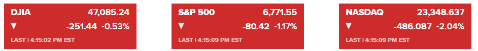 标普500指数下跌1.17%,收于6,771.55点;纳斯达克综合指数大跌2.04%,收于23,348.64点;道琼斯工业平均指数下跌251.44点(0.53%)。