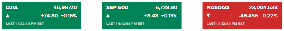 纳斯达克下跌 0.21%,收于 23,004.54点。相比之下,标普500指数和道琼斯工业平均指数小幅收涨。标普500上涨 0.13%,收于 6,728.80点;道指上涨 74.80点(0.16%),收于 46,987.10点。盘中最低时,纳指一度下跌 2.1%,标普500下跌 1.3%,道指则下挫逾 400点(约0.9%)。