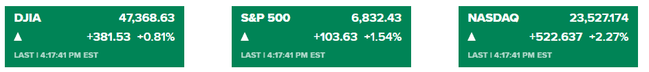 道琼斯工业平均指数上涨381.53点,涨幅0.81%,收于47,368.63点;标普500指数上涨1.54%,至6,832.43点;纳斯达克综合指数强劲反弹2.27%,收于23,527.17点。