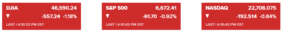 道琼斯工业平均指数下跌 557.24 点(1.18%),收于 46,590.24 点,主要受 AI 龙头英伟达、Salesforce 与 苹果 的下跌影响。标普500指数下跌 0.92% 至 6,672.41 点;纳斯达克综合指数下跌 0.84%,报 22,708.08 点。