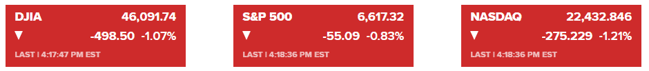 道琼斯工业平均指数下跌 498.50 点,跌幅 1.07%,收于 46,091.74 点。标普 500 指数下跌 0.83% 至 6,617.32 点。这是该广泛指数连续第四个交易日收低,创下自 8 月以来最长连跌纪录。纳斯达克综合指数下跌 1.21% 至 22,432.85 点。在盘中低点,道指一度下跌近 700 点(1.5%),标普 500 和以科技股为主的纳指则分别下跌 1.5% 和 2.1%。