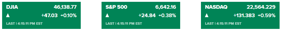 标普500指数上涨 0.38%,收于 6,642.16 点;纳斯达克综合指数上涨 0.59%,收于 22,564.23 点;道琼斯工业平均指数上涨 47 点(0.1%),收于 46,138.7 点。