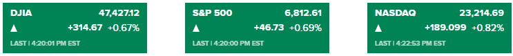 道琼斯工业平均指数上涨 314.67 点,涨幅 0.67%,收于 47,427.12 点。标普 500 指数上涨 0.69%,收于 6,812.61 点,而纳斯达克综合指数上涨 0.82%,收于 23,214.69 点。