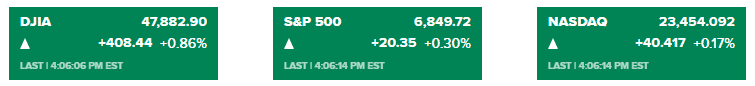 这个由30只股票组成的指数上涨了471点,涨幅为1%。标普500指数上涨了0.5%,而纳斯达克综合指数上涨了0.4%。