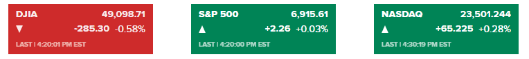 以科技股为主的纳指上涨 0.28%,收于 23,501.24 点;蓝筹股道指下跌 285.30 点,跌幅 0.58%,收于 49,098.71 点。高盛股价大跌近 4%,对道指形成拖累。大盘标普 500 指数小幅上涨 0.03%,收于 6,915.61 点。