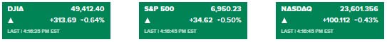 大盘标普 500 指数上涨 0.50%,收于 6,950.23 点。道琼斯工业平均指数上涨 313.69 点,涨幅 0.64%,收于 49,412.40 点。纳斯达克综合指数上涨 0.43%,收于 23,601.36 点。以科技股为主的纳指受到苹果(Apple)、Meta Platforms 和微软(Microsoft)股价上涨的提振,三者在本周稍晚发布财报前分别上涨约 3%、2% 和 1%。
