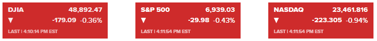 标普500指数下跌0.43%,收于6,939.03点;道琼斯工业平均指数回落179点,跌幅0.36%,收于48,892.47点。两大指数在盘中低点时均一度下跌逾1%。以科技股为主的纳斯达克综合指数表现不佳,下跌0.94%,收于23,461.82点。