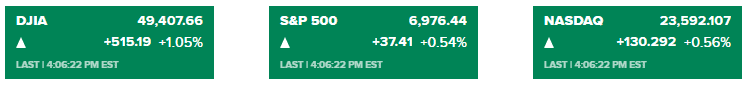 道琼斯工业平均指数上涨515点,涨幅1.05%;标普500指数上涨0.54%;纳斯达克综合指数也上涨0.56%。