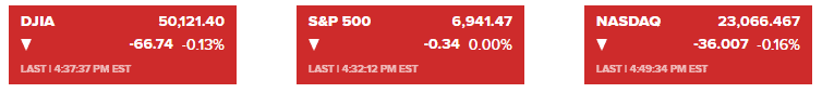 道指小幅下跌66.74点,跌幅0.13%,收于50,121.40点;标普500指数微跌不到1点,报6,941.47点;纳斯达克综合指数下跌0.16%,收于23,066.47点。