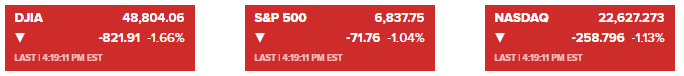 周一,美股明显回调。道琼斯工业平均指数下跌821.91点,跌幅1.66%,收于48,804.06点;纳斯达克综合指数下跌1.13%,收于22,627.27点;标普500指数下跌1.04%,收于6,837.75点,年内再度转负。