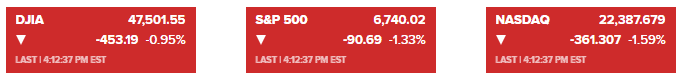 道琼斯工业平均指数下跌453.19点,跌幅0.95%,收于47,501.55点。标普500指数下跌1.33%,收于6,740.02点;纳斯达克综合指数下跌1.59%,收于22,387.68点。