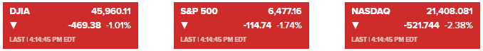 标普500指数下跌1.74%;纳斯达克综合指数下跌2.38%;道琼斯工业平均指数下跌约470点,跌幅1.01%。