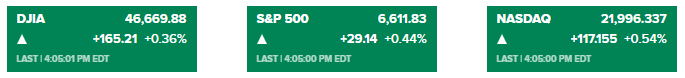 该广泛市场指数上涨0.45%,纳斯达克综合指数上涨0.54%,道琼斯工业平均指数上涨约164点,涨幅为0.35%。
