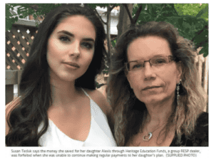 其实不止是在魁北克,在安省也曾发生过家长购买团体RESP,差点血本无归的事情。图中的母亲名字叫Susan,她从女儿出生1个月开始就购买了Heritage 教育基金计划,到2016年共存了8300加币。